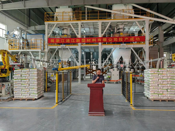 儀式結(jié)束后,大家走進(jìn)了漣江新型材料有限公司的生產(chǎn)車間進(jìn)行參觀,從青島環(huán)港重工科技有限公司采購(gòu)的一條6方機(jī)、一條4方機(jī)石膏砂漿設(shè)備已實(shí)現(xiàn)智能化生產(chǎn)。