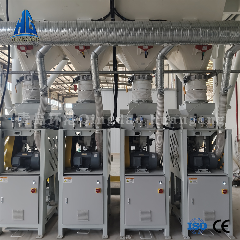 年產(chǎn)兩萬(wàn)噸左右的砂漿生產(chǎn)線,一般情況下會(huì)用到3-6個(gè)原料罐,其中兩個(gè)大罐用于裝放散裝水泥和粉煤灰,其余小罐用于裝放輕鈣、重鈣、砂等。散裝水泥和粉煤灰進(jìn)罐不需要提升設(shè)備,依靠泵車打入。散裝粉煤灰倉(cāng)一般為圓筒支架結(jié)構(gòu),其上部有除塵設(shè)備,防止粉塵泄漏,下部裝有破拱裝置,防止粉料結(jié)塊,使粉料卸出順暢,并裝有料位傳感設(shè)備,可隨時(shí)掌握倉(cāng)內(nèi)物料使用情況。